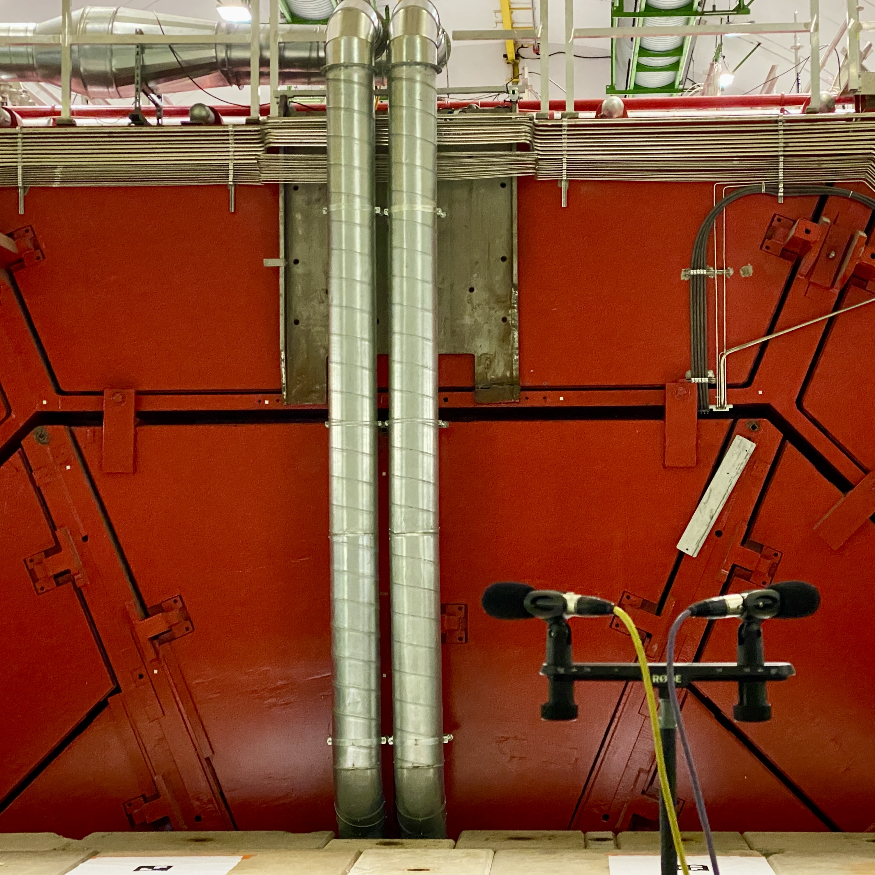And, in a more reflective phase of my accelerator activation escapades, I was drawn to a curious alcove, where a dipole and quadrupole magnet sit as if contemplating the experiment they were once part of. I acoustically reactivated these, using transducer speakers to find their natural harmonic frequencies, so that the magnet assemblies themselves became the speakers. Each had its own tone, its own presence in a sense, and acoustic interference patterns were formed between each magnet’s frequencies, which imbued the space with invisible energy. I drew this field on the floor around the magnets with a piece of chalk (from a theorist’s blackboard), manifesting the once energetic qualities of these entities through sound and drawing. Unlike some of my previous projects at CERN, this time I was exploring minimal impact and immaterial interventions.